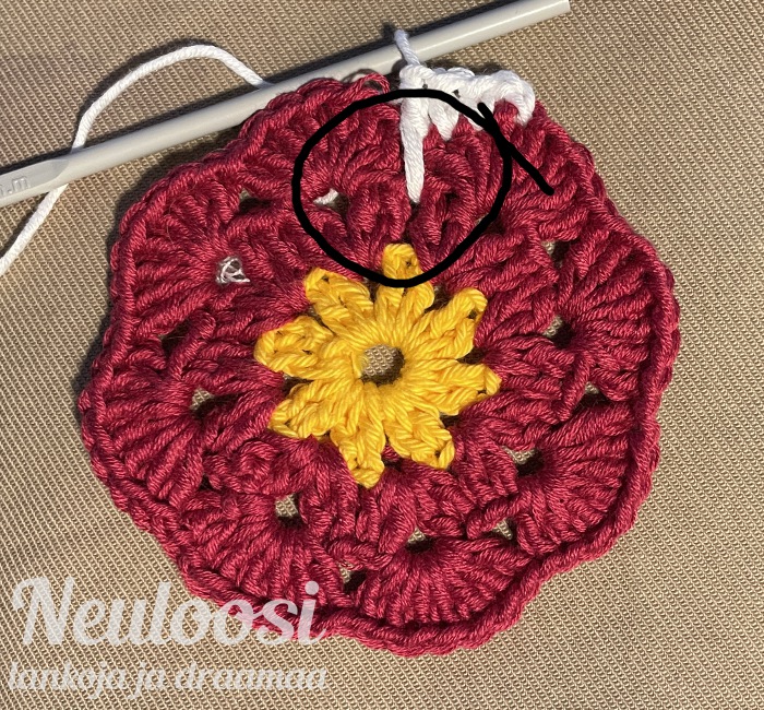 Vielä lisäyksenä, että kierros 5 saattaa kupruttaa kukkasta myöskin siinä kohtaa kun terälehtien välistä virkataan edelliselle kierrokselle se lanka (ks valkoinen lanka). Se pitää ”kiepauttaa” tarpeeksi löysästi.